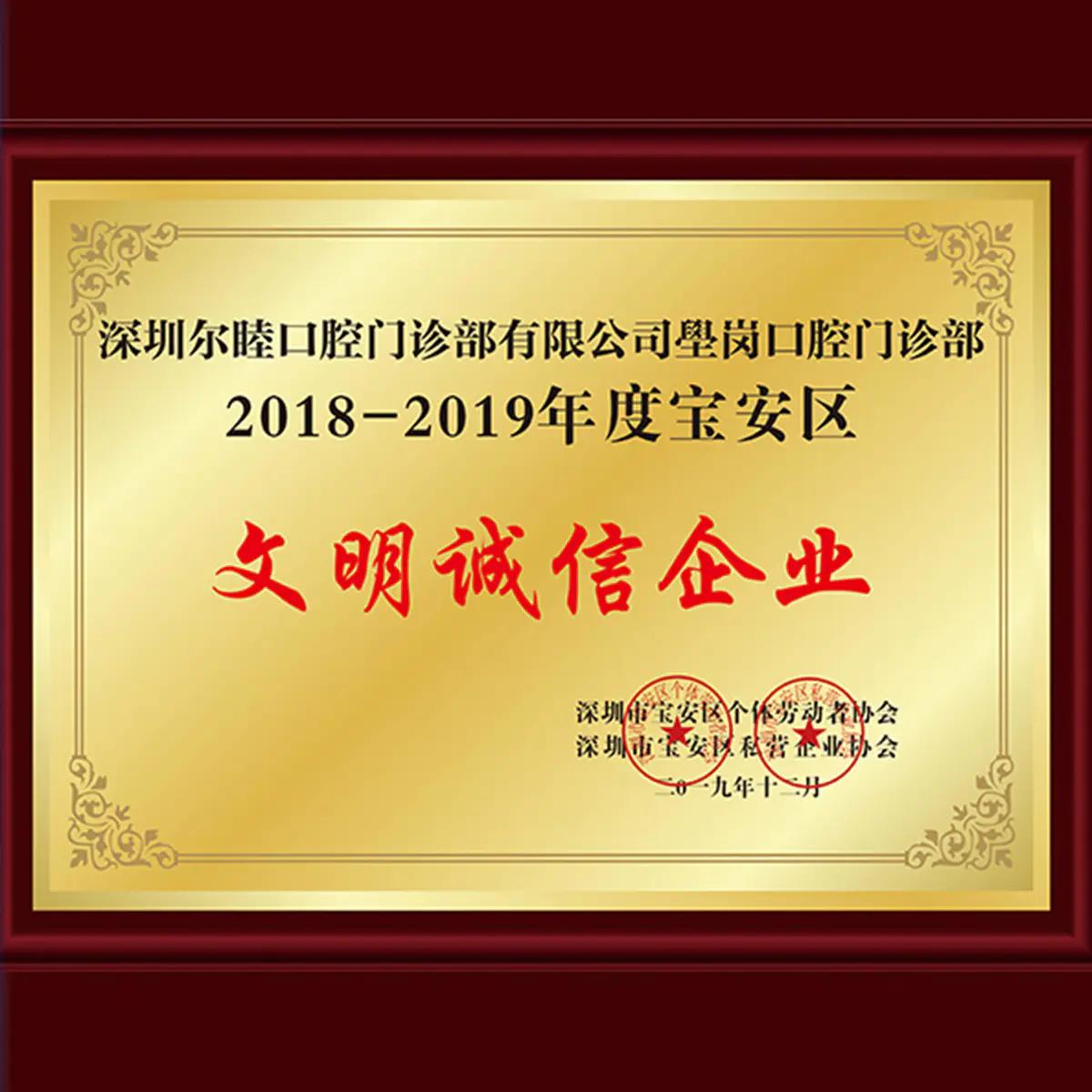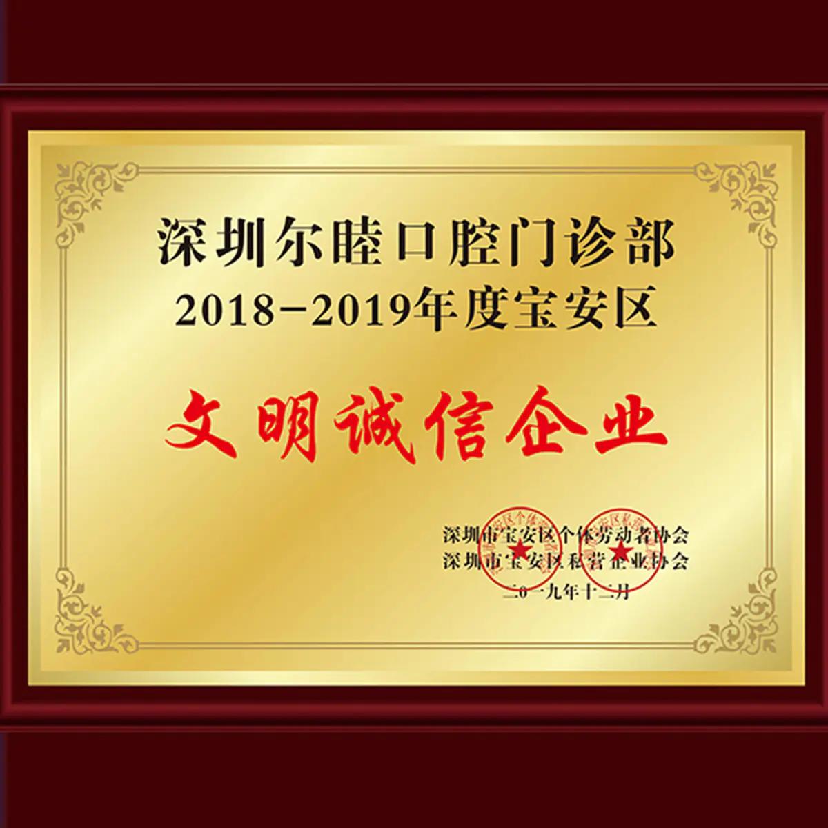 2019年12月27日,尔睦口腔壆岗店、尔睦口腔丽沙花都店同时被评为“2018-2019年度宝安区——文明诚信企业”,由深圳市宝安区个体劳动协会、深圳市宝安区私营企业协会颁发荣誉。